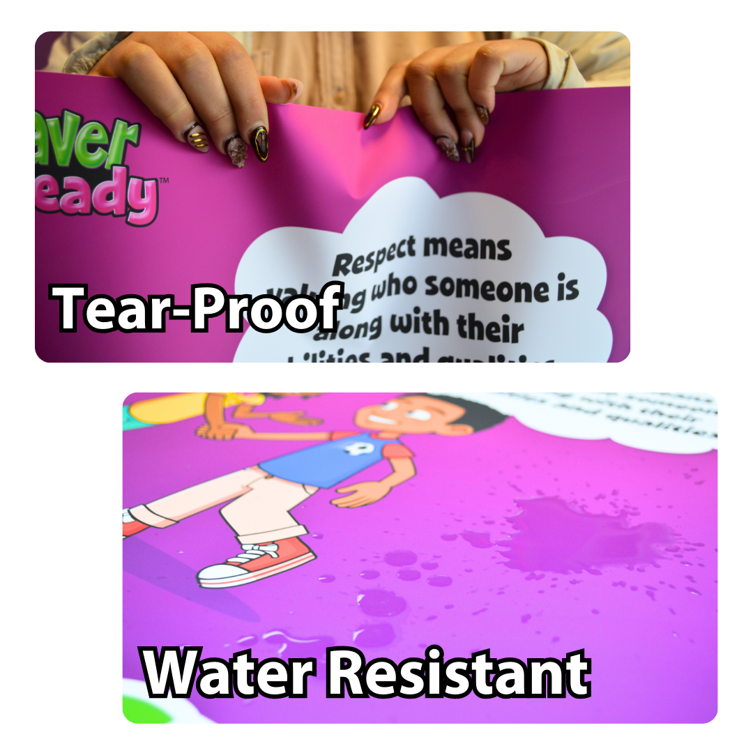 Printed on water-resistant and tear-proof material and safely rolled in a sturdy tube.